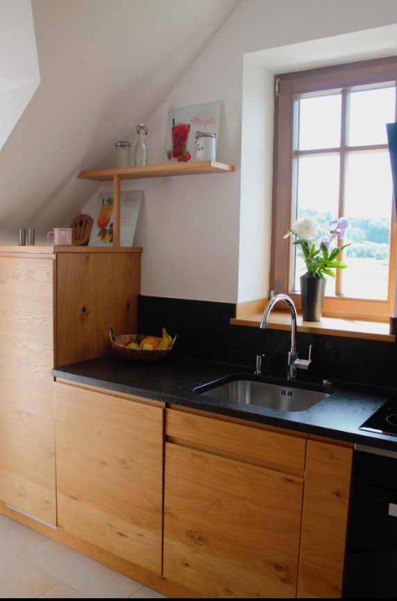 - In der gesamten Ferienwohnung sind nur exklusive Baumaterialien verbaut worden, wie z. B. Eichenparkettböden, Solnhofer Fließen, ………..